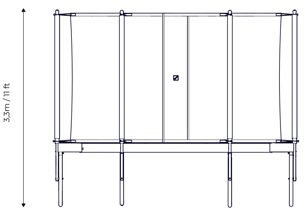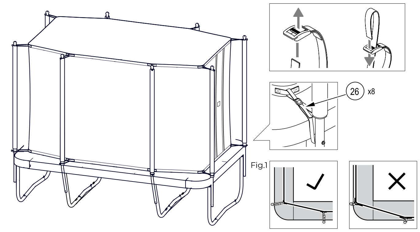Attach the short side of the net first. Adjust the lower edge of net to the centerline of safety pad as instructed in fig.7 with adjustable straps (part #26). The door opening can be placed on the short or the long side of the trampoline.