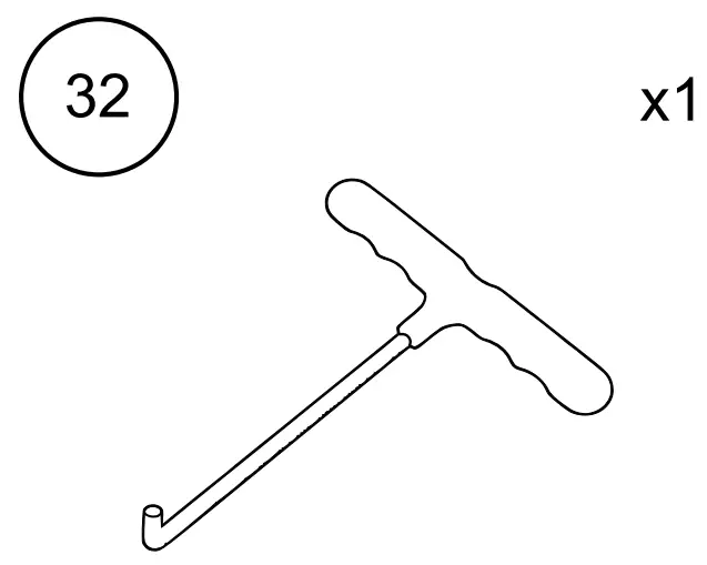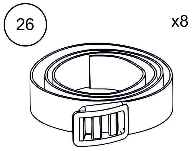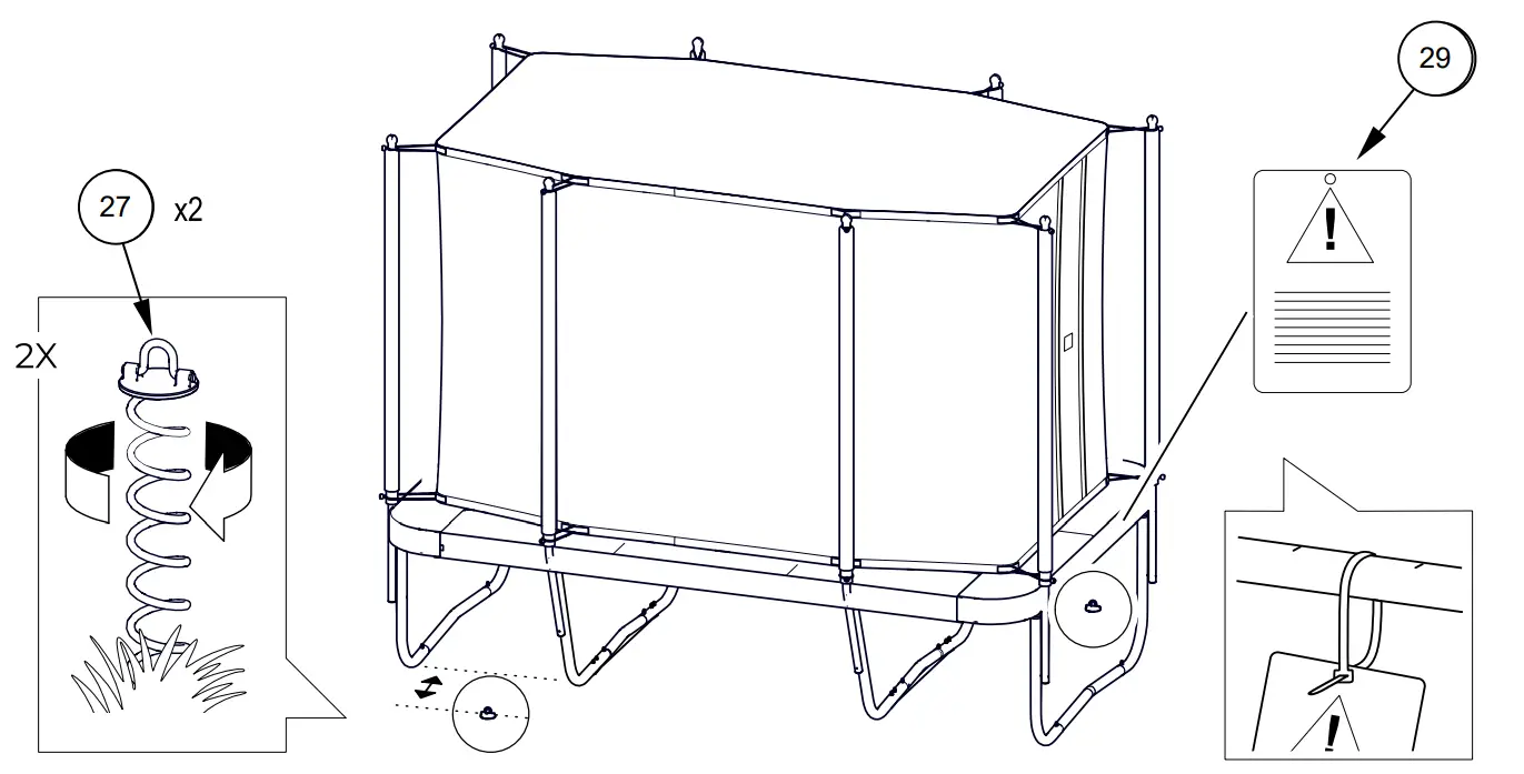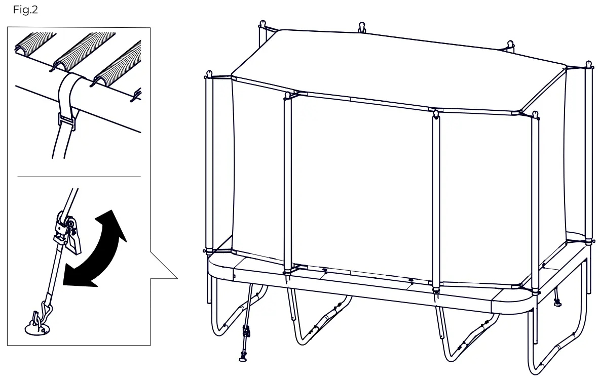 ENSURE THAT NO UNDERGROUND UTILITIES SUCH AS ELECTRICAL CABLES ARE PRESENT WHERE YOU INSTALL THE ANCHORS. Screw the anchors (#27)into the ground as instructed below. Fig. 2: Tie the strap of the anchor set over the upper frame of the trampoline. Attach the hook into the loop of the anchor base. Tighten with the ratchet.