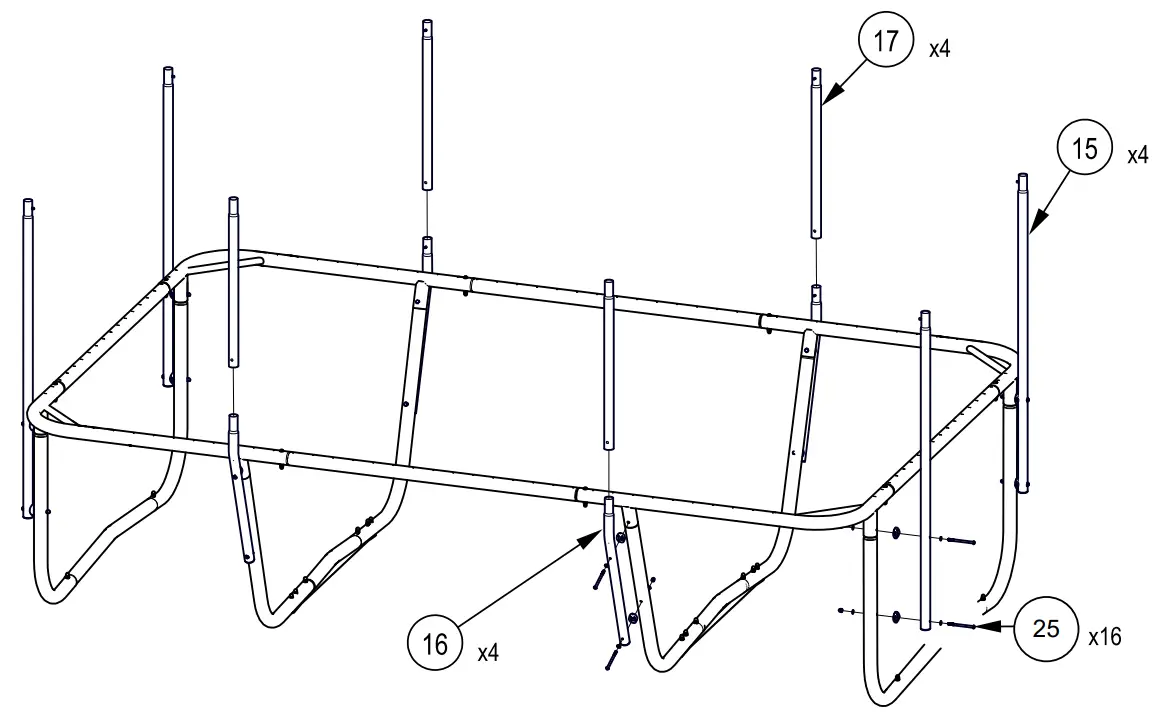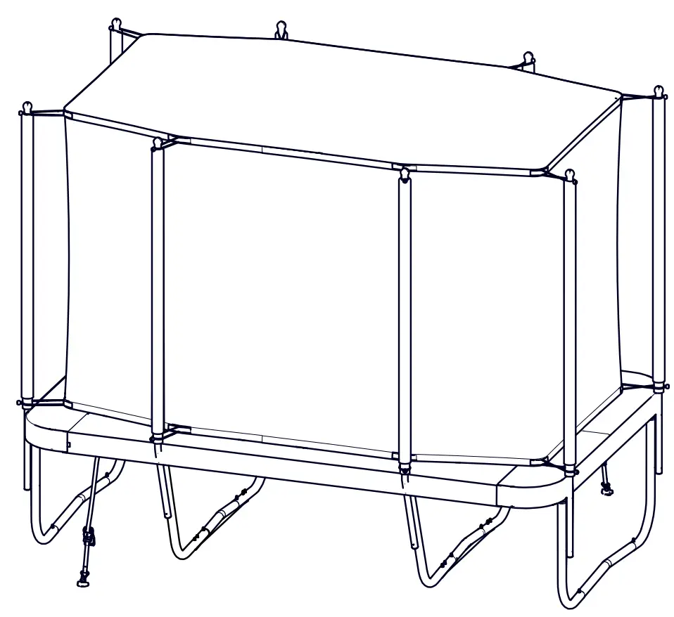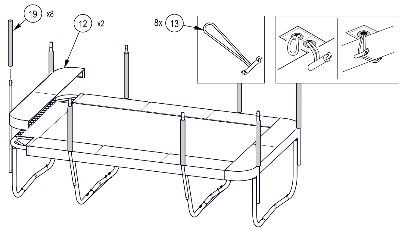 - Attach safety pads (#11 and #12) to t he frame with bungee cords (#13). Tip: using spring pull tool is helpful. If necessary, loosen the upper bolt of t he enclosure pole slightly when placing t he skirt of the safety pad between t he enclosure pole and frame. REMEMBER TO RE-TIGHTEN.
