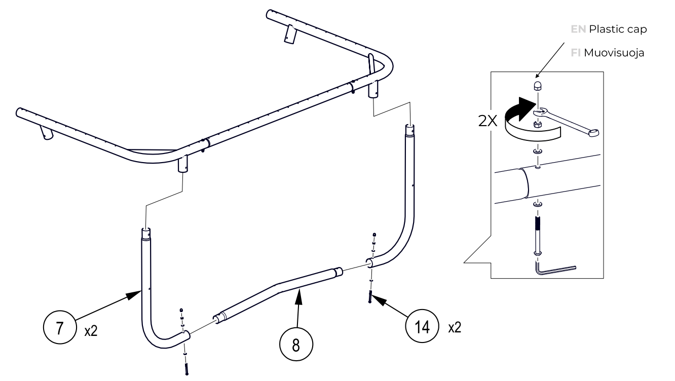 Add the plastic protective caps. DO NOT USE POWER TOOLS.