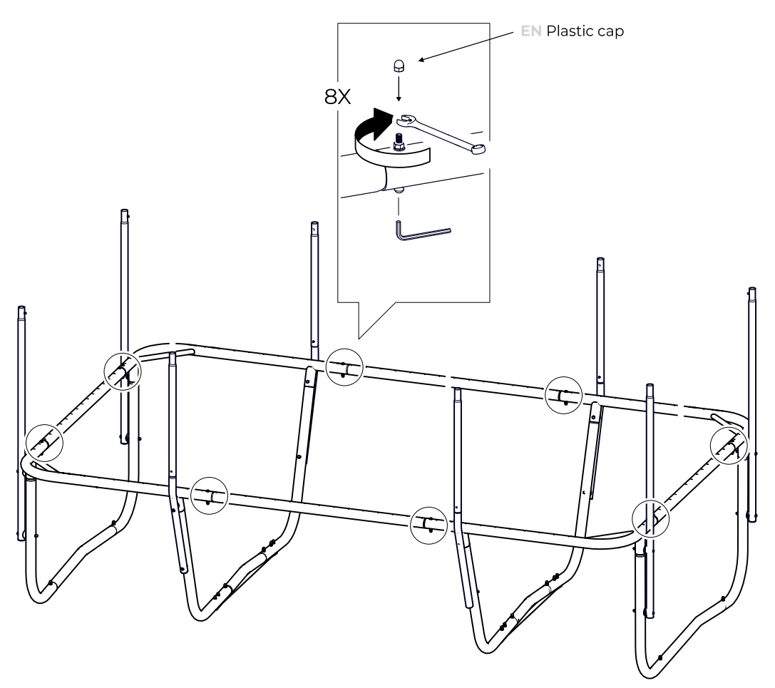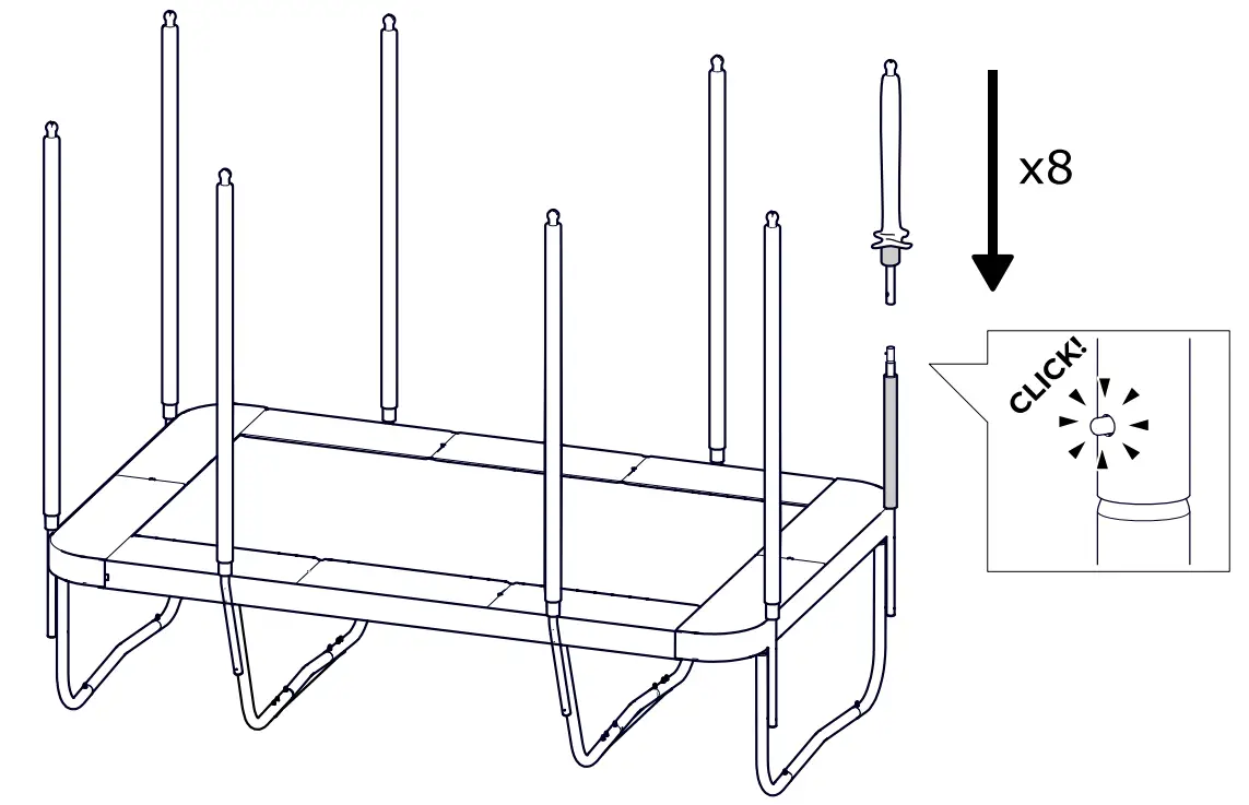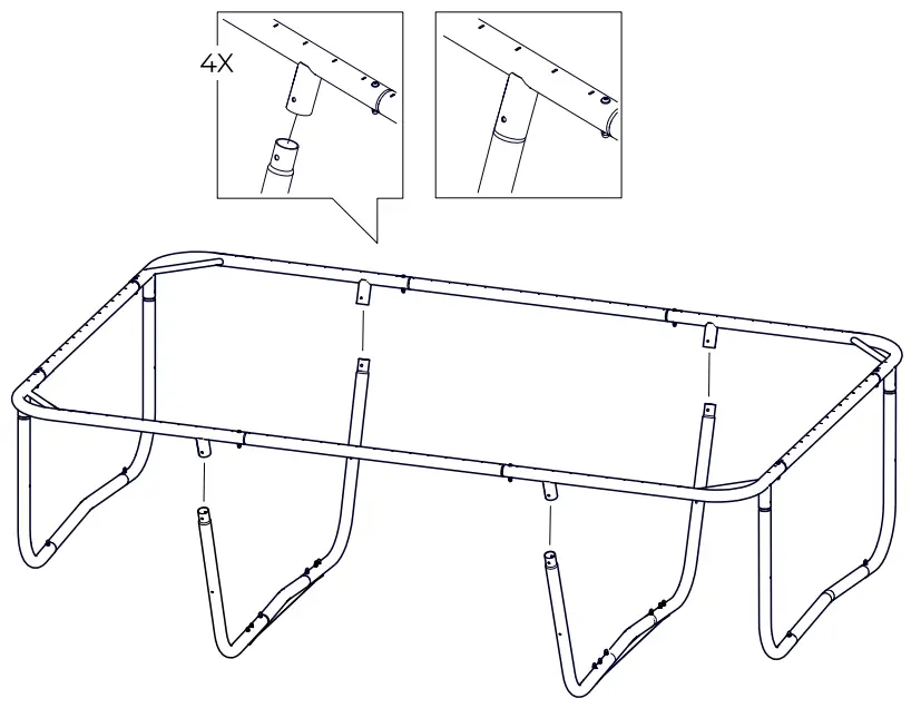 - Connect the trampoline ends with top frame tubes {#6). Tube #6: the side with more spring holes must be faced up. NOTE: lock nut is supposed to stop after a few twists while hand tightening.