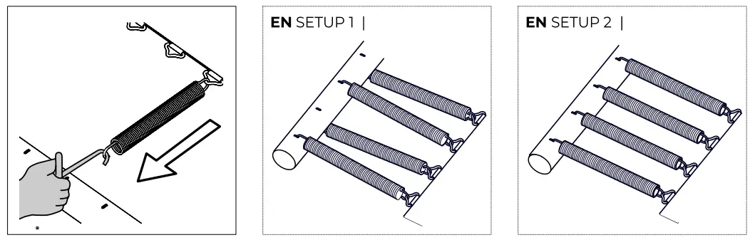 SETUP 1: Bouncy and excellent performance. Every other spring is attached to the holes underneath the top frame tubes. Begin the spring installation by attaching the corner springs to the mat and the holes underneath the top frame. NOTE: Only every other hole on the top of the frame will be used in this setup. All of the holes underneath the top frame will be used.