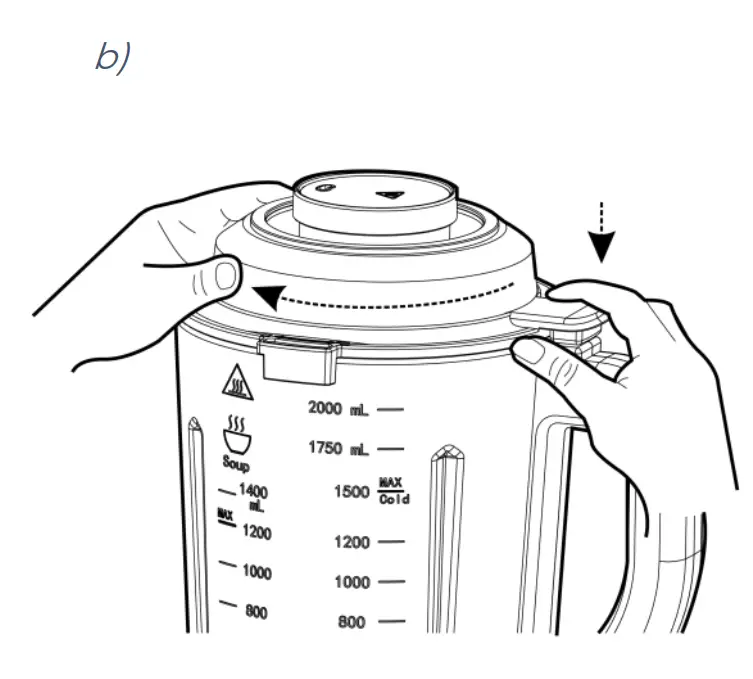 WARNING! The min product level in the blender is 750ml. Do not exceed the max level for hot liquids (1200ml) and cold liquids (1500ml), it may cause overflow. Do not open the lid of the blender cup while the blender is in operation. If you hear an intermittent sound of the blade turning when chopping food, this is normal. If you lift the bowl or open the lid of the blender while it is running, the protection will be triggered, and the motor will stop. Do not add sugar, plant stems or legumes (beans, peas, chickpeas, lentils) to the bowl, as the blade can jam, and it can cause damage to the device. To clean the blender blade ⑥ use the brush ⑭ . Before plugging in, make sure that the bowl is securely seated on the blender base and that the bowl lid is closed.