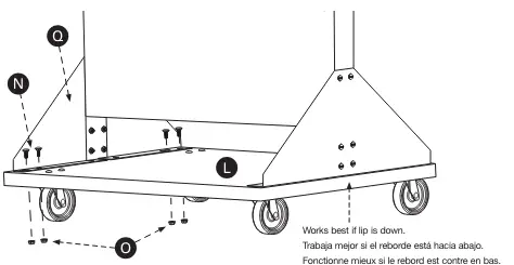 Fonctionne mieux si le rebord est contre en bas. P Attach four casters (M) to the dolly (L) and stiffener (P) with eight carriage bolts (N) and flange nuts (O). Use only inside holes. Hand tighten only. Fije cuatro ruedas giratorias (M) a la carretilla (L) y refuerzos (P) utilizando ocho pernos de cabeza redonda (N) y tuercas de reborde (O). Use sólo agujeros interiores. Solo apriete con la mano. Fixez quatre roulettes (M) au chariot (L) et pièces de renfort (P) à l’aide de huit ![]() boulons ordinaires (N) et écrous àbride L (O). N’utilisez que les trous intérieurs. Serrer à la main seulement. 2 Attach rack system to the dolly, bolting through (Q), (L), (P) and (M) with eight carriage bolts (N) |