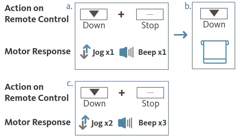 b. Press and hold (about 5 sec) “Down” and “Stop” buttons simultaneously until motor jogs x2 and beeps x3.
