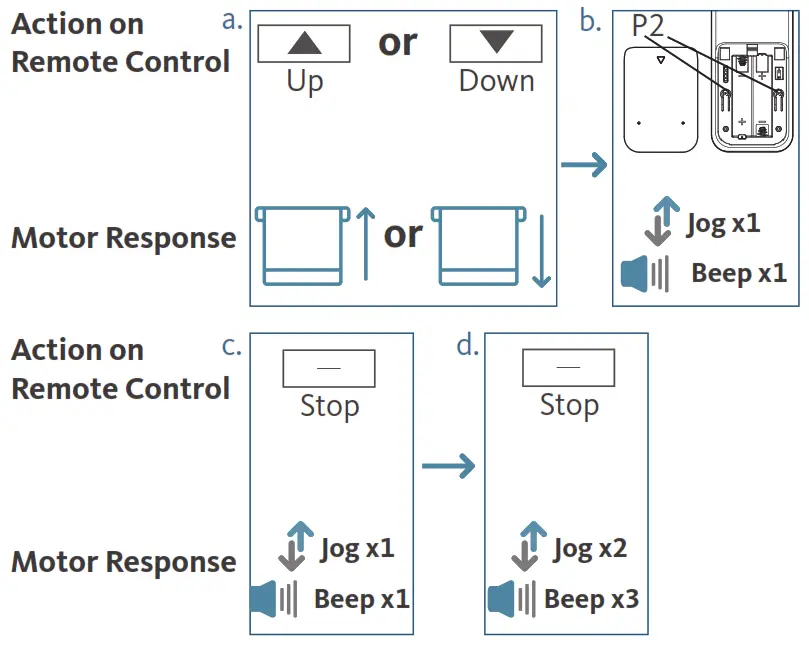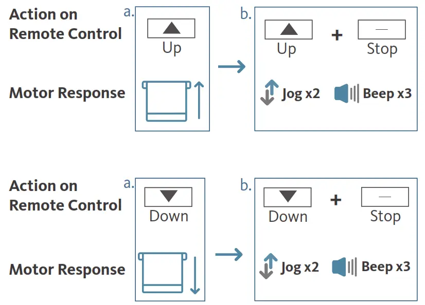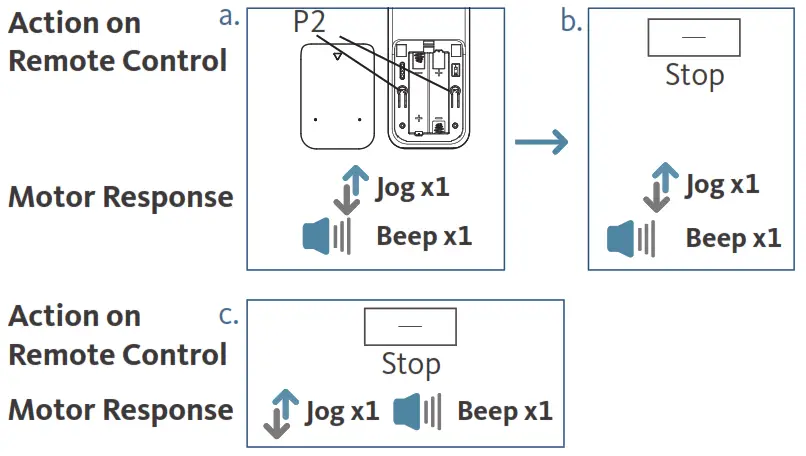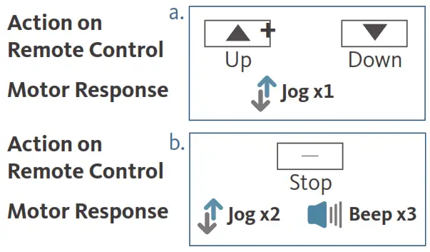 b. In the next 10 secs, press and hold “Stop” button on the remote control until motor jogs x2 and beeps x3.