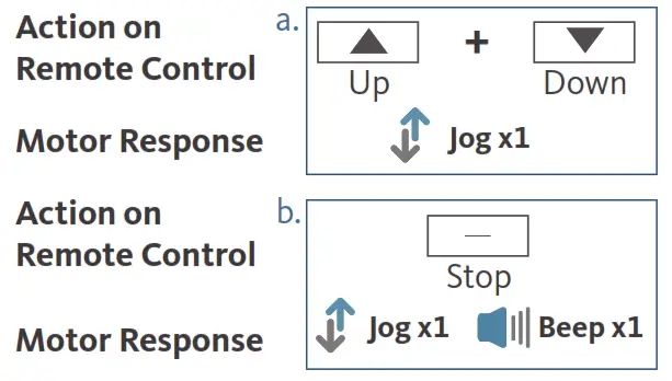 a. Press and hold (about 5 sec) “Up” and “Stop” buttons simultaneously until motor jogs x1 and beeps x1.
