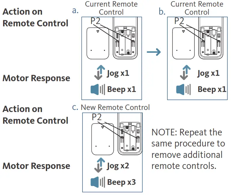 b. Press and hold (about 2 sec) “Stop” button until motor jogs x1 and beeps x1. - ADD OR REMOVE ADDITIONAL REMOTE