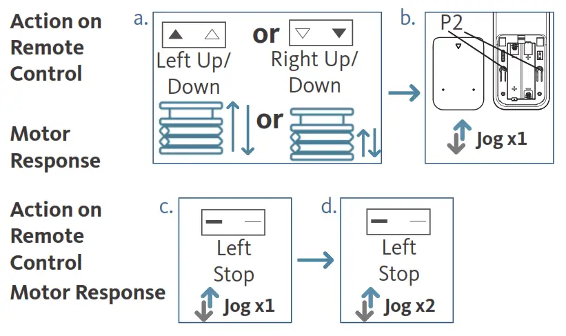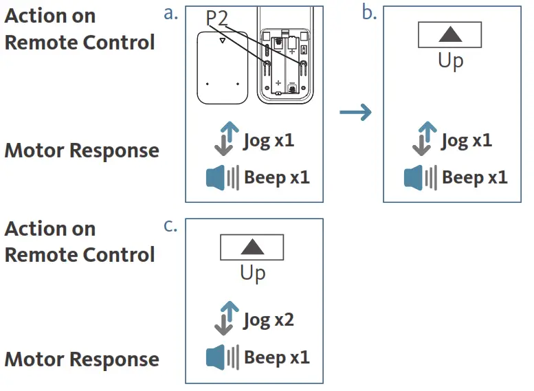 b. Press Left or Right “P2” button (per Left/Right paired) on the back of remote control until motor jogs x1 and beeps x1.