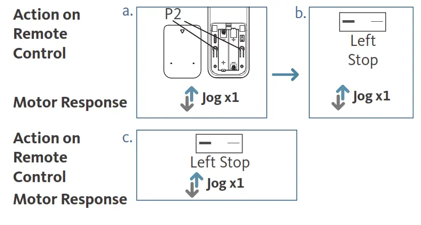 b. Once more, on the current remote control, press Left Side “P2” button until the motor jogs x1.