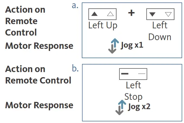 a. Press and hold (about 5 sec) Left “Up” and Left “Stop” buttons simultaneously until the motor jogs x1