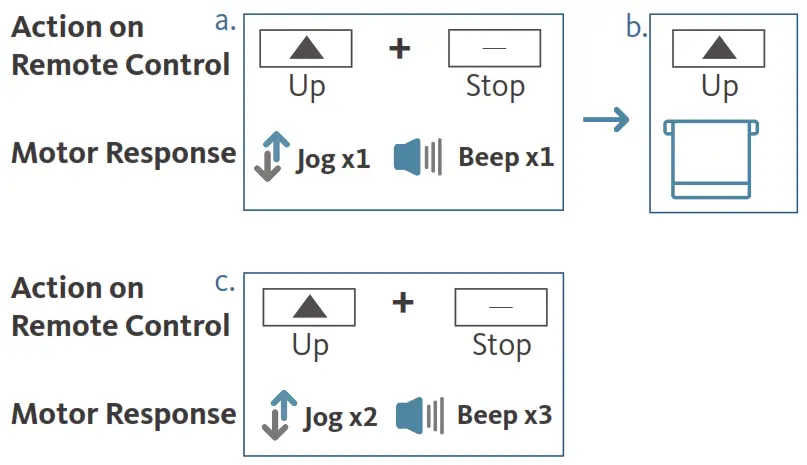 c. Press and hold (about 5 sec) “Up” and “Stop” buttons simultaneously until motor jogs x2 and beeps x3.