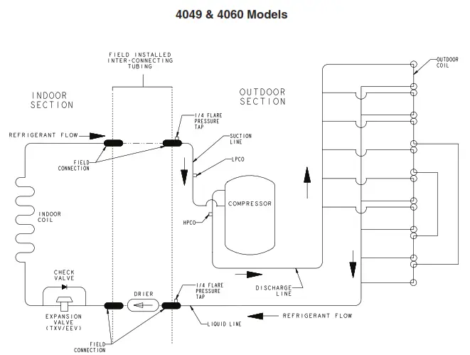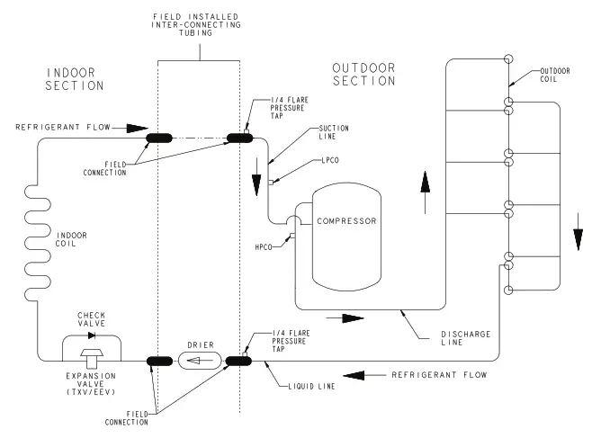 The outdoor condensing units are factory charged with the system charge required for the outdoor condensing unit, ten (10) feet of tested connecting line, and the smallest rated indoor evaporative coil match. Always verify proper system charge via subcooling (TXV/EEV) or superheat (fixed orifice) per the unit nameplate.