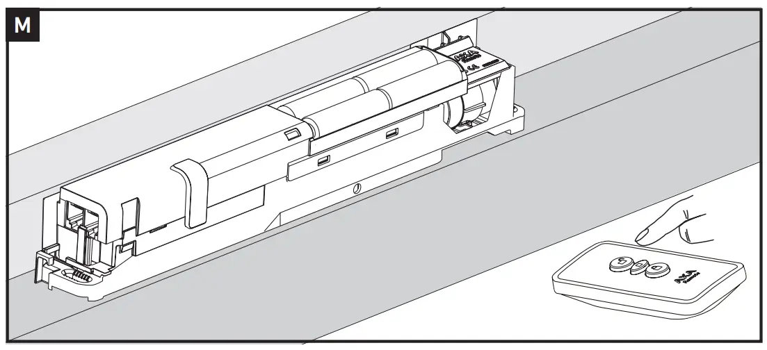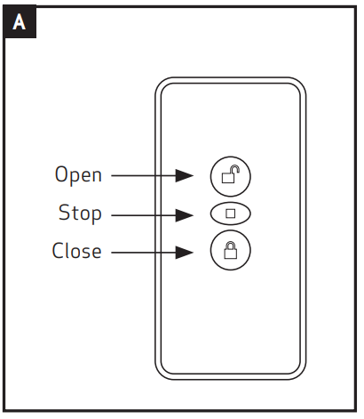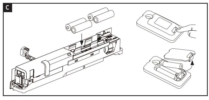 - Place 2x AAA batteries in the remote control and 4x AA batteries in the closing unit (figure C ).