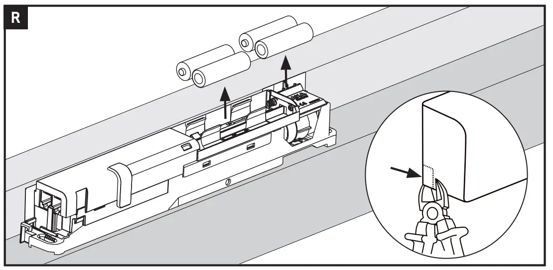 Use cutters to cut a small snippet from the cover, in the semi-perforated area (figure R ). - Click the adapter wire into the closing unit: