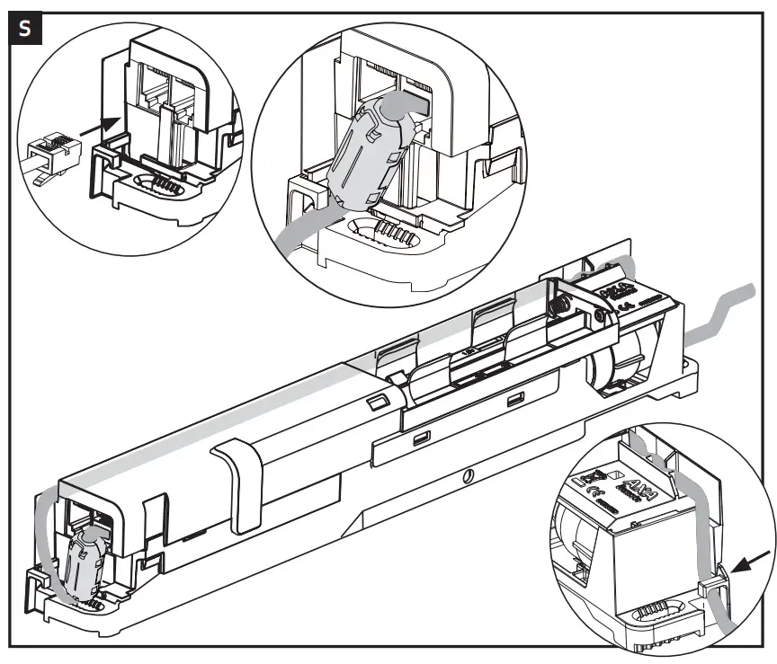 – lead the wire through the opening on the right-hand side of the closing unit and under the designated hook (figure S ). Place the adapter into the power socket