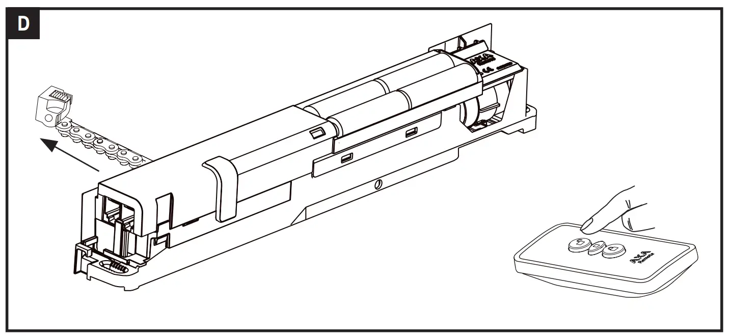 – A window unit can be configured to maximum 8 remote controls. - 3 Press the Open button again and allow the chain to fully exit the closing unit.