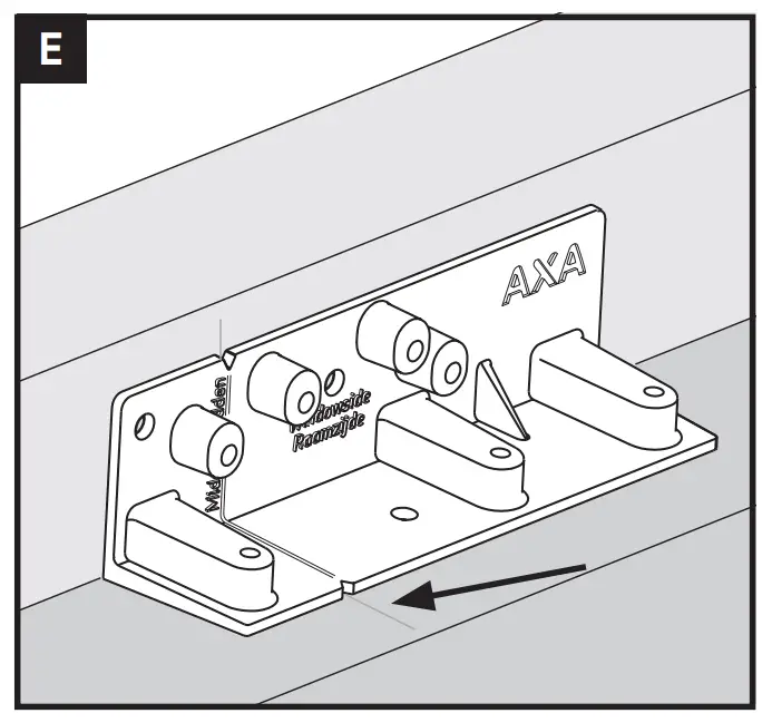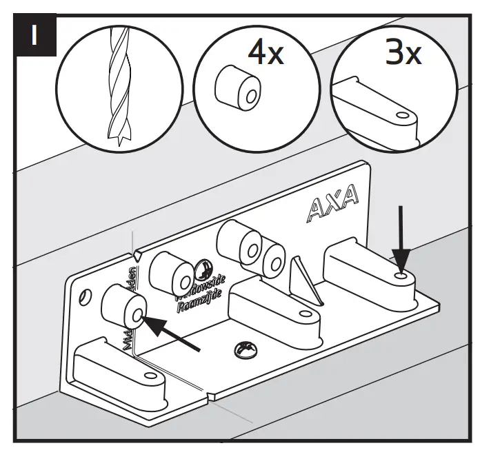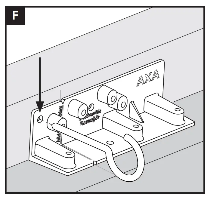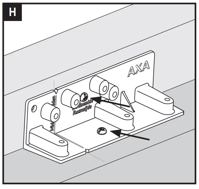 - Place the drilling template, with the centre of the V sign on the marked central point, firmly against the window and window casing (figure E ). Mark the hole (figure F ) and screw the screw hook into the window through the opening of the drill template (pre-drill Ø 2 mm). Use this screw hook to properly close the window; ensure the drilling template is firmly against the window and window casing (figure G ). Mark 2 assembly points through the drilling template (figure H ). Pre-drill the assembly points (Ø 2 mm).