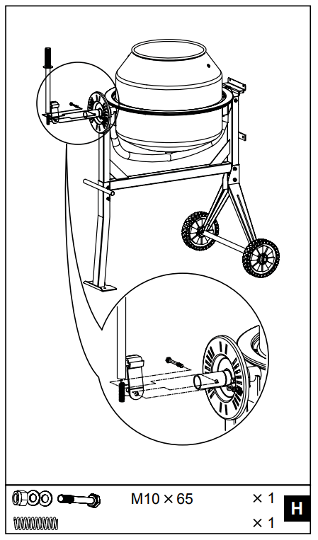 The drum is locked in position by lugs on the self-locating tipping bar/wheel which engage into the locking plate on the mixer frame. To tilt the drum, withdrawn the tipping bar to dis-engage the locking lugs. This then allows the tipping bar and drum to be turned in the same direction.
