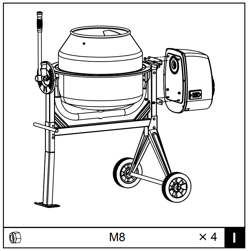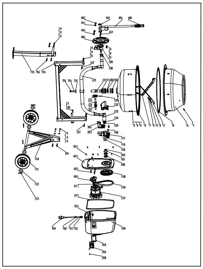 Thoroughly clean the mixer at the end of each day’s operation. Keep your mixer clean. The slightest trace of material left in the drum will harden and attract more each time you use it until the machine is useless. Dried cement should be scraped out of the drum. Do not throw bricks into mixer drum to clean it out. Do not beat on the drum with a shovel, a hammer or other tools to break up accumulations of dried cement mix, as damage to the mixer may result. The drum may be scoured for approximate 2 minutes, using 1” gravel and water mixture. Then discharge the gravel/water mixture and hose down the drum assembly inside and out. The IP44D protection class construction of the concrete mixer enables you to hose down the drum assembly safely.