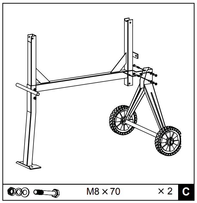 - With the frame lying on its side, attach the support leg as shown. Insert two M8X70 hex bolts through the holes from one side, then flat washers, lock washers and nuts from the other side.
