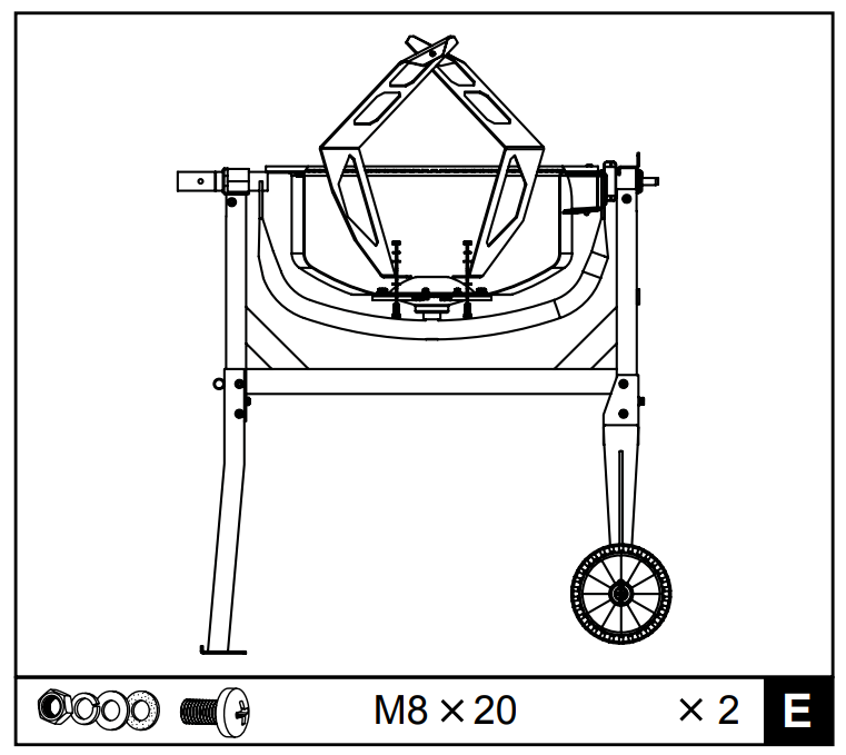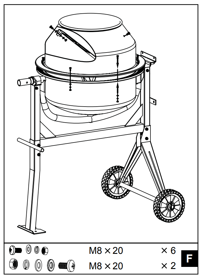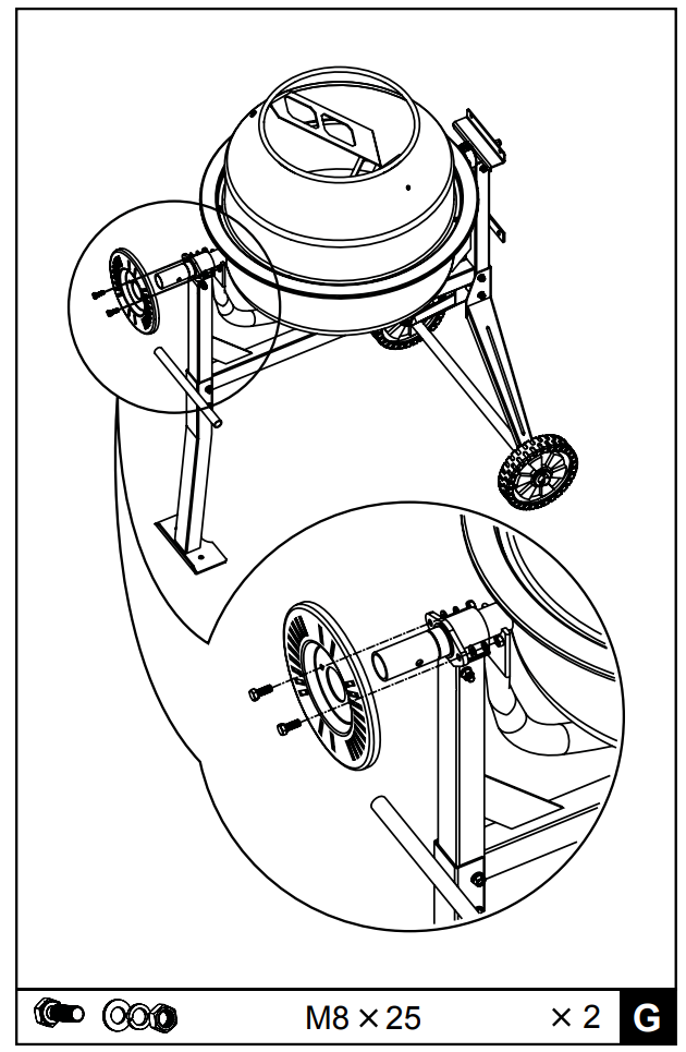 - Secure the mixing blades to the upper drum by inserting two M8X20 cross headed screws, from the outside through the holes in the drum.