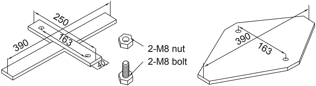 The filter pump must be vertically fixed on the ground or a base made of wood or concrete before use. There should be two holes 9mm in diameter on the base, the space between which should be 163mm. Put filter pump on the base and attach them together by fastening the bolts and nuts. All the base parts should weigh at least over 18kg to prevent the pump from accidentally falling.