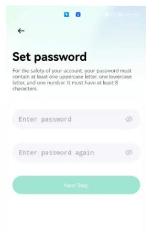 Set the login password and confirm the login password. Then tap “Next Step”. (For your account’s safety, the password needs to be a combination of at least 8 characters and upper and lower case letters.)