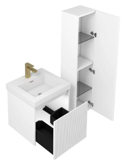 - Drawers front with fluted design. 45 degree integrated door pull with