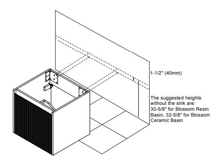 The suggested heights without the sink are 30-5/8″ for Blossom Resin Basin, or 32-5/8″ for Blossom Ceramic Basin. Depending on the sinks selected, the total height will vary from 33-1/2″ (850mm) to 35-1/4″ (895mm). If an alternate height desired, adjust the rough-in and backing material heights using the dimensions provided.