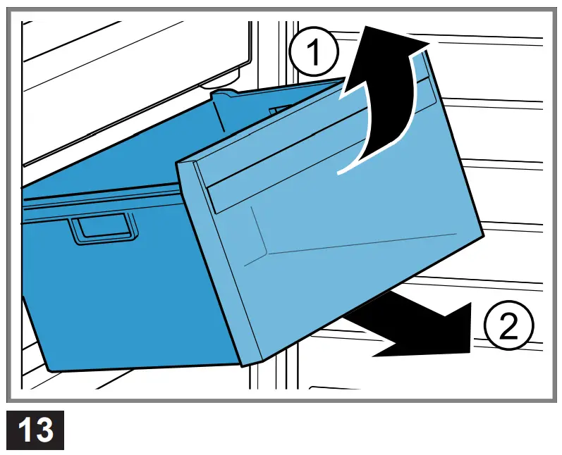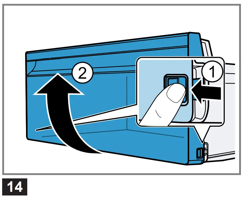 - Press in the snap-in hooks on the side of the container and remove the front from the container in a turning motion .