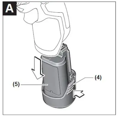 Note: The battery is supplied partially charged. To ensure full battery capacity, fully charge the battery in the charger before using your power tool for the first time. The lithium-ion battery can be charged at any time without reducing its service life. Interrupting the charging process does not damage the battery. The lithium-ion battery is protected against deep discharge by the “Electronic Cell Protection (ECP)”. When the battery is discharged, the power tool is switched off by means of a protective circuit: The application tool no longer rotates. Do not continue to press the On/Off switch after the power tool has automatically switched off. The battery can be damaged. To remove the battery (5), press the release buttons (4) and pull the battery downwards out of the power tool. Do not use force to do this. Follow the instructions on correct disposal.