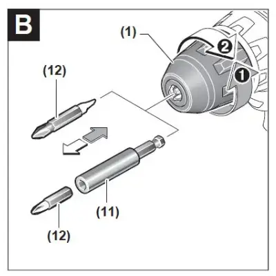 Remove the battery from the power tool before carry-ing out work on the power tool (e.g. maintenance, changing tool, etc.). The battery should also be re-moved for transport and storage. There is risk of injury from unintentionally pressing the on/off switch. The drill spindle is locked when the on/off switch (7) is not pressed. This makes it possible to change the application tool in the drill chuck quickly, conveniently and easily. Open the keyless chuck (1) by turning it in the direction of rotation