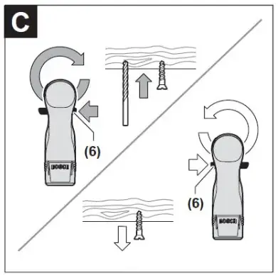 Note: The use of batteries unsuitable for your power tool can lead to malfunctions or damage to the power tool. Set the rotational direction switch (6) to the middle position to avoid unintentionally switching it on. Insert the charged battery (5) into the handle until you feel it engage and it is flush with the handle. Setting the rotational direction (see figure C)