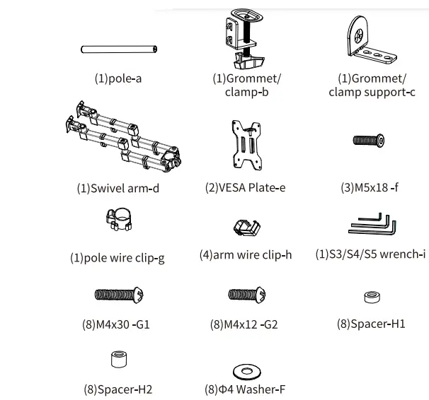 1. Connect grommet support (c) and pole (a) with 3 pieces of M5x18 (f) and tighten it with wrench (i) (figure 1). Insert grommet support (c) into desk hole whose diameter is over 1.65in/42mm (figure 2).