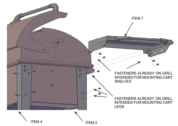 - NOTE: The cart shelves are attached with 4 specific fasteners that are already on your grill where shown above. All of these fasteners are held by threaded inserts pressed into the grill.