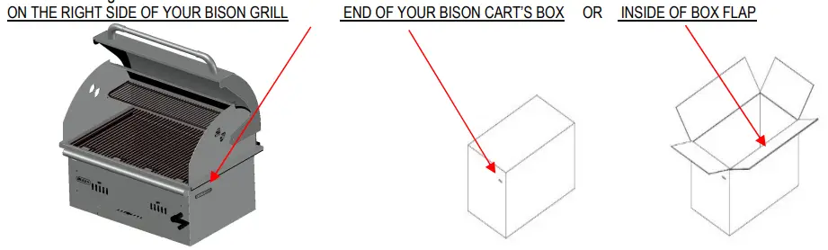 Grill it was sold with. This information will be required for all warranty claims, ordering replacement parts and will identify any variations of your unit. It is extremely important that you record your serial number and register your grill from the Proof of Purchase. The grill serial number locations are shown below.