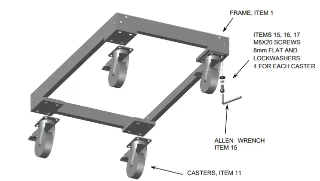 Per illustration below, attach casters to pre-installed nuts on frame with provided fasteners and Allen wrench.