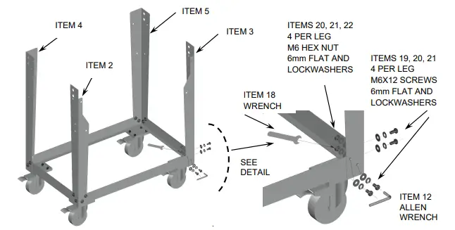 Per illustration below, attach cart legs to on frame with provided fasteners and tools.
