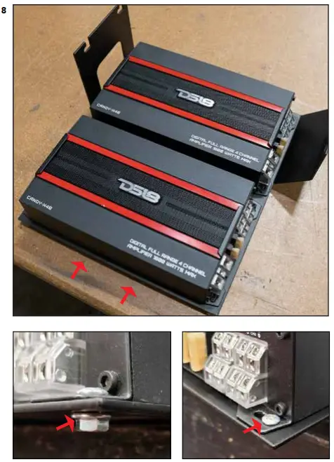8. Now it’s time to install the amplifiers to the Amp Rack using the supplied “C” screws, tight them well using a 7mm socket and the #2 Philips screwdriver. Check the position of the amp as you can see in the picture for easy wiring access, before putting this under the seat you can go ahead and install the speaker and amplifier wiring, this is an easy way to access the terminals