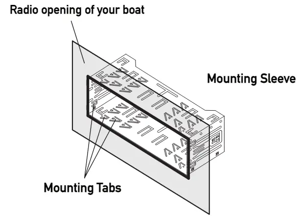 Bend the mounting tabs around the mounting sleeve around the radio opening of your boat as shown in the image to the right.