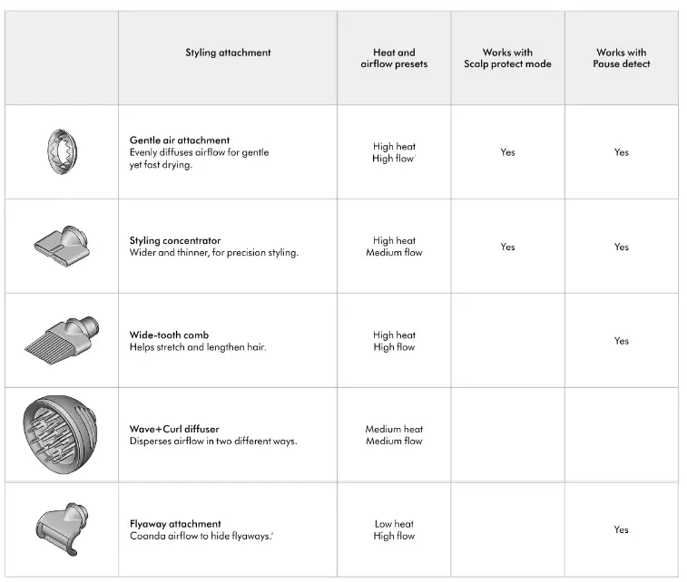 - Gentle air attachment follows the same default presets as the hair dryer with no attachment connected.