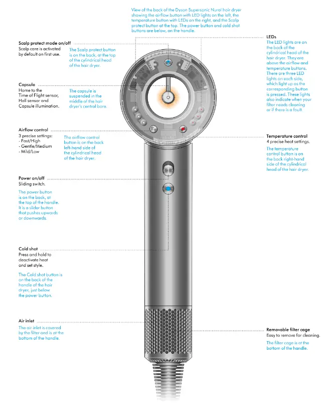 Back view of the Dyson Supersonic Nural™ hair dryer. Starting at the head of the machine, the Scalp protect button is at the top, airflow button on the left, and temperature button on the right. The handle has power and Cold shot buttons at the top, and the filter cage at the bottom.