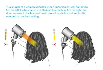 Scalp protect mode is activated by default on first use. Locate the Scalp protect button at the top of the cylindrical head of the hair dryer.