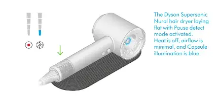 Tip: To be sure Pause detect has activated, wait for the motor sound to ramp down before lifting your hand off the hair dryer. Capsule illumination will pulse blue.