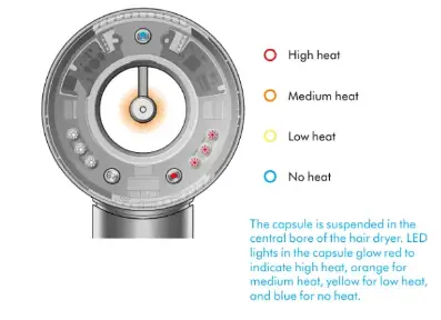 The suspended capsule changes colour to show the current heat setting. Heat, and colour, will auto-adapt in Scalp protect mode.