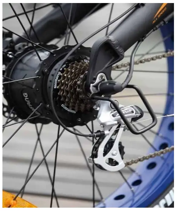 The ebike has a thumb shift Shimano 7-speed gearing system. We find that users rarely change gears because the electric motor takes away all the strain, but it is still useful to have gears whenever you decide to pedal while cruising, or trying to get more exercise, or extend your range. The combination of gearing, and the 5 levels of variable pedal assist power from the motor means that you can always find the most efficient gear and pedal power level to be able to go the distance.