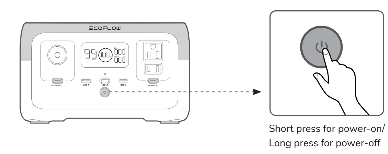 Press the “DC output switch” or “AC output switch” once to turn on their corresponding DC/AC output sockets; press again to turn them off.