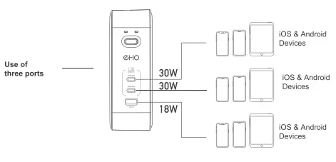 | Output | USB-C1/USB-C2 Output: 5V/3A,9V/3A, 12V/3A, 15V/3A,20V/3.25A (65W Max Each Port) PPS: 3.3-16V/3.25A 3.3-21V/3A USB-A Output: 5V/3A,9V/2A,12V/1.5A (18W Max) USB-C1 +USB-C2 Output: 5V/3A,9V/3A, 12V/2.5A, 15V/2A,20V/1.5A 30W+30W (60W Max) PPS: 3.3-16V/2A 3.3-21V/1.5A USB-C1+USB-C2+USB-A Output: 30W+30W+18W (78W Max) USB-C1 +USB-NUSB-C2+USB-A Output: 65W+18W (83W Max) |