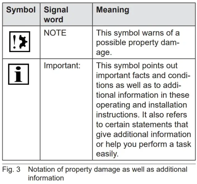 • The following table defines the representation used in the operating instructions and description of situations where damage can occur to the product or refers to important facts, conditions, tips and information.